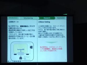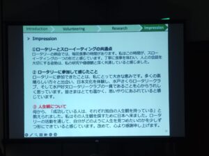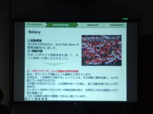 4つのテーマを用意しました。自己紹介、ボランティア活動、研究内容、ロータリー米山奨学金とボランティア活動ついての感想です。